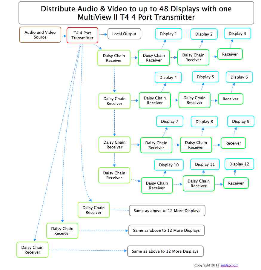 See the example below that illustrates the daisy chain "DP" receivers. The example is shows a T4 Transmitter