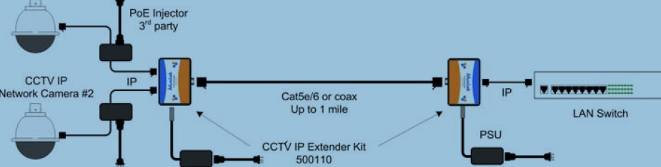 The IP Extender Kit #500110 allows IP camera equipment, or any other IP equipment to be connected up to one mile using one coax cable with BNC or one Cat 5/5e/6 unshielded twisted pair cable in a point-to-point configuration. The maximum distance is dependent on speed required, type and length of cable. The kit comes with one transmitter (camera side), one receiver (network side) and two identical wall-mount power supplies. The camera side can accept one or two IP-cameras without an additional Ethernet switch/router.