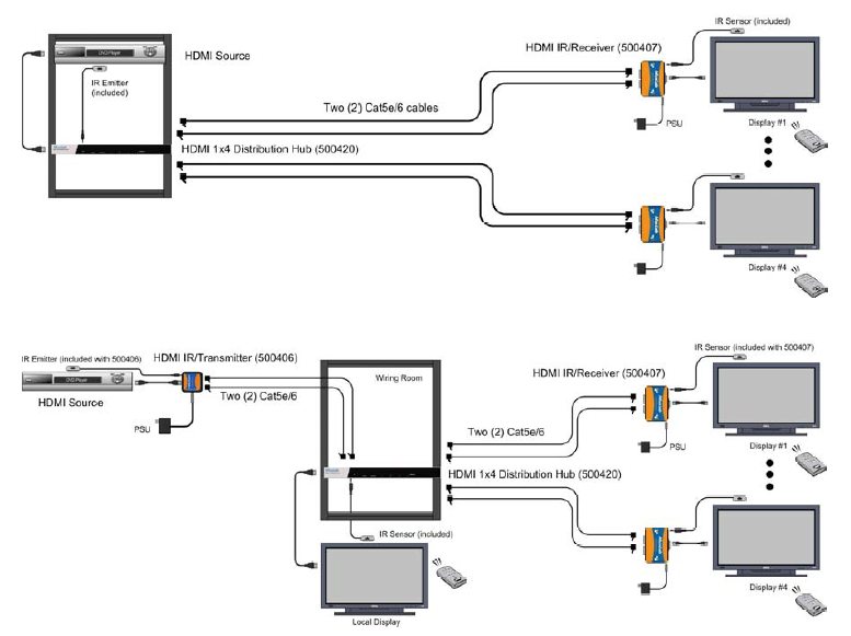 The product supports up to 150 ft (46m) at 1080p/8-bit via Cat5e cable on either side of the hub. The product supports remote IR control and works in conjunction with the HDMI IR/Extender 500405 (kit), the 500406 (Transmitter) and 500407 (Receiver).