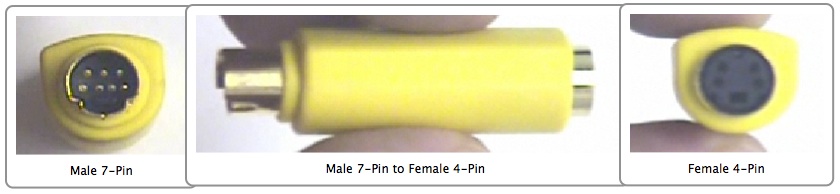 This adapter can be used as a port saver and allows you to use a regular 4-pin cable on the 7-Pin S-Video TV out on laptops. It was designed to perfectly fit the 7-pin port on laptops and allows you to pass the color video signal. It features a male 7-pin S-Video connector on one end and a female 4-pin S-Video connector on the other end.