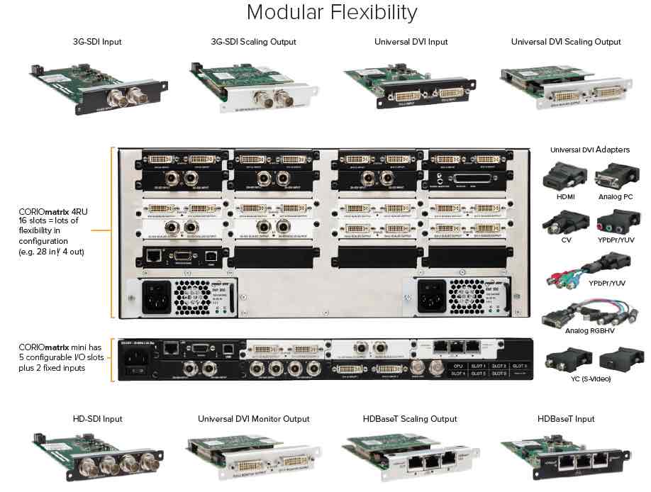 CORIOmatrix Universal Input and Output Matrix Router with up to 32 ports available, depending on the modules. The CORIOmatrix chassis-frame ships with one CPU module and one fixed DVI-I input module (with two inputs) and a single Power Supply Unit. A redundant Power Supply Unit is optional.