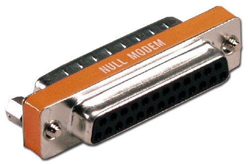 Connects any serial device with DTE DB25 to PC with DB25 serial port using a straight thru DB25 cable. This RS232 null modem adaptor converts a DTE DB25 to DCE DB25 port or vice versa. The added shielding provides data protection against EMI/RFI and slim design reduces bending & provides secure connection.