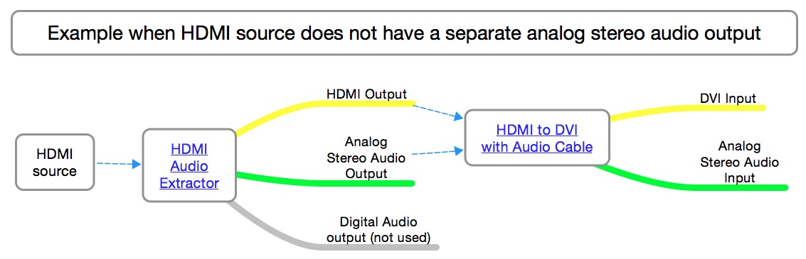 HDMI Audio Extractor. that outputs both digital audio and analog stereo audio. The HDMI Audio Extractor outputs analog stereo audio on a 3.5mm jack and you can use the cable with the 3.5mm plug to connect to it.