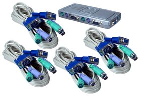 Control four computers from one keyboard, VGA monitor and mouse. It is plug & play, no software to install and supports simultaneous boot-up. Provides superior compatibility with 4D/multi-button mouse & trackball, hot-key & push-button for PC selection, supports 200MHz video and resolution of up to 1920x1440. Hot-Plug allows for the addition and removal of connected PC's without shutting down the KVM. Includes 4 (6 ft.) PS/2 KVM combo cables. (Connectors to Console: HD15 Female/2 Mini6 Female; Connectors to PC: 4 HD15 Male/8 Mini6 Female)
