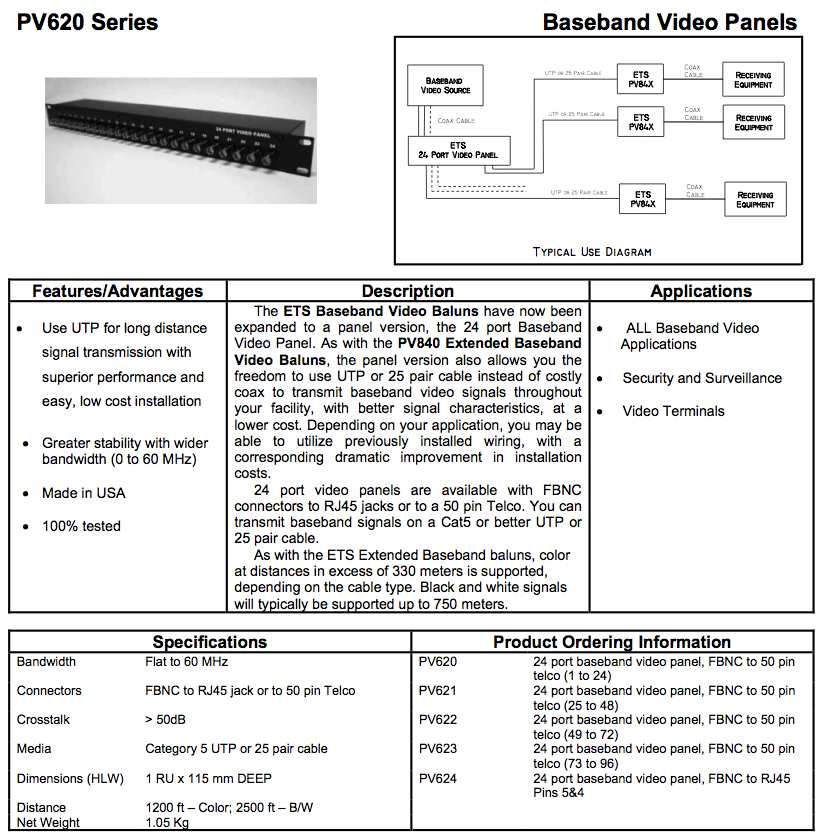 24 Port Baseband Video Panel, Female BNC to 50 pin Telco (label 49-72). Please scroll down to see Data Sheet