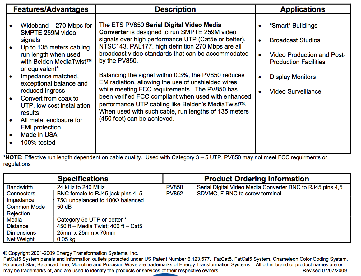 Send SMPTE 259M video signals (bandwidth to 240 MHz) over CAT5E or better UTP cable with PV850 or PV852.