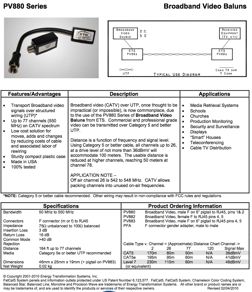 Broadband Video is a common name for the type of transmission that is used by cable television (CATV) systems. The audio is part of the same signal as the video, and multiple channels are carried on the same wire, in different frequency ranges. ETS offers both Standard and Ultra Broadband Video Baluns - these differ in the distance and maximum number of channels that can be transmitted over UTP cabling. These baluns have been used in the most demanding video environment there is, live-broadcast television studios.