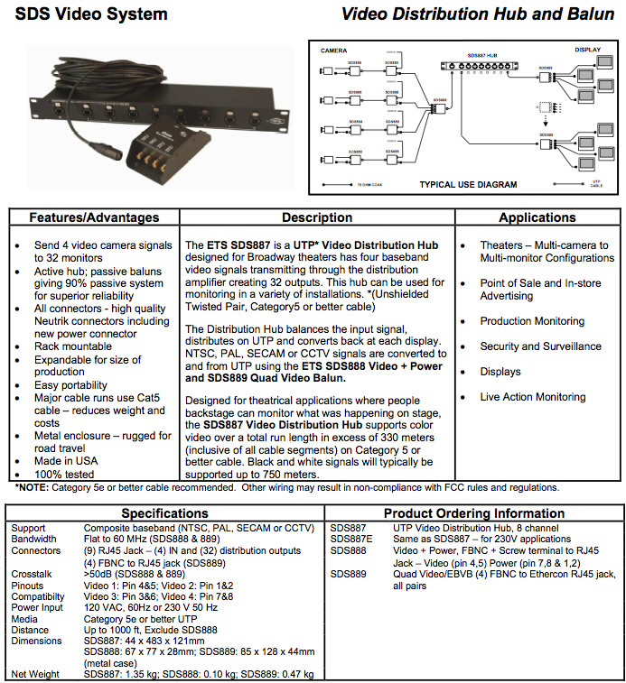 The SDS887 is an 8 channel UTP Video Distribution Hub that allows the distribution of four (4) composite video input signals per UTP to up to 32 monitors when used with the Video Balun SDS889 and the Quad Video Balun SDS889.